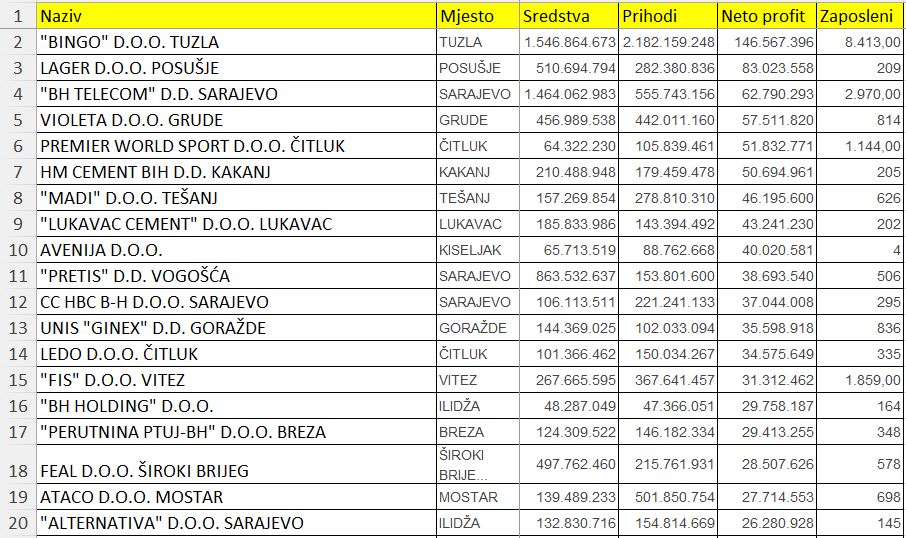Podaci su to koje vam donosi portal Biznis.ba, a kroz koje ćemo vam u nastavku prikazati 100 kompanija u Federaciji BiH sa najvećom neto dobiti.