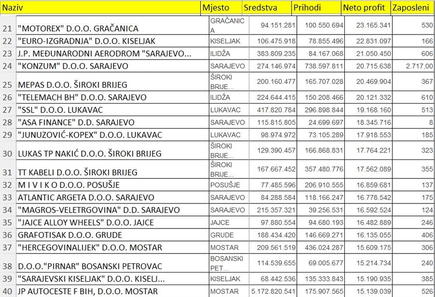 Na poziciji broj jedanaest je "PRETIS" D.D. VOGOŠĆA sa dobiti od 38,693,540 KM. Slijede CC HBC B-H D.O.O. SARAJEVO sa 37,044,008 KM, UNIS "GINEX" D.D. GORAŽDE sa 35,598,918 KM, LEDO D.O.O. ČITLUK 34,575,649 KM, "FIS" D.O.O. VITEZ sa dobiti od 31,312,462 KM, zatim "BH HOLDING" D.O.O. sa Ilidže 29,758,187 KM, "PERUTNINA PTUJ-BH" D.O.O. BREZA 29,413,255 KM, FEAL D.O.O. ŠIROKI BRIJEG 28,507,626 KM, ATACO D.O.O. MOSTAR sa 27,714,553 KM dobiti, dok listu od 20 najvećih po neto dobiti zaokružuje "ALTERNATIVA" D.O.O. SARAJEVO sa 26,280,928 KM.