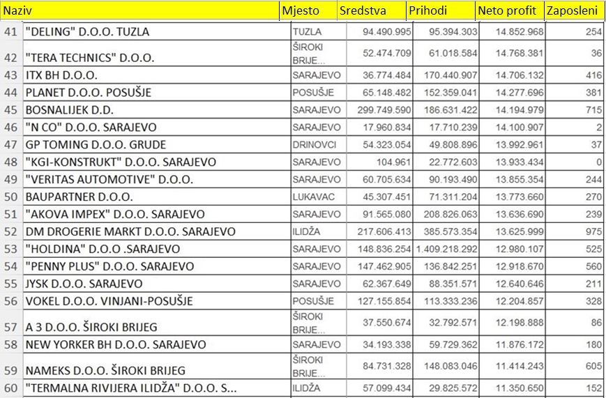 Peta je kladionica PREMIER WORLD SPORT D.O.O. ČITLUK sa dobiti 51,832,771 KM. Šesti je HM CEMENT BIH D.D. KAKANJ koji je imao dobit od 50,694,961 KM. Slijede "MADI" D.O.O. TEŠANJ sa 46,195,600 KM, "LUKAVAC CEMENT" D.O.O. LUKAVAC sa 43,241,230 KM te na desetom mjestu AVENIJA D.O.O. iz Kiseljaka sa 40,020,581 KM.