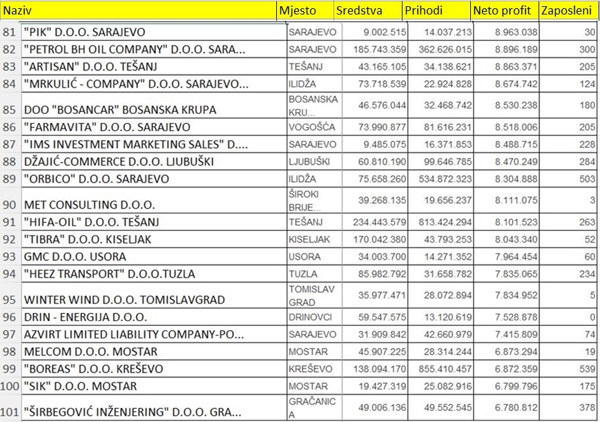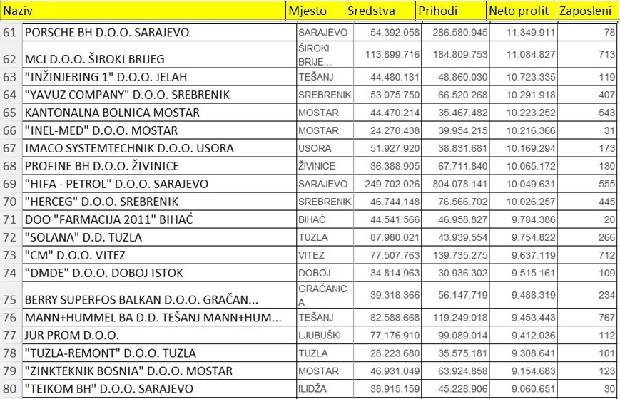 U tabelama u nastavku pogledajte dobiti ostalih kompanija u Federaciji BiH koje su ušle među 100 najuspješnijih po ovom osnovu.