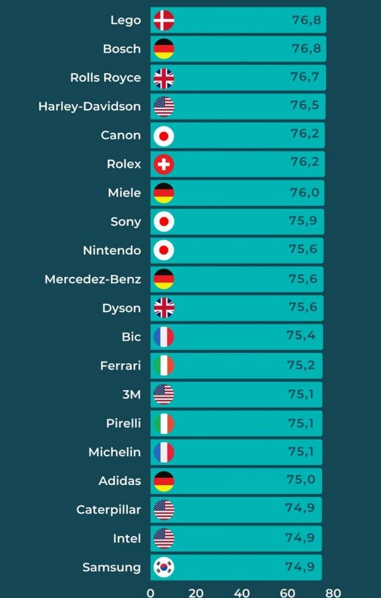 Na prvom mjestu s najboljom ocjenom, 76.8, ponovo se našao LEGO Group, kompanija za proizvodnju igračaka sa sjedištem u Billundu, u Danskoj, koja je najpoznatija po proizvodnji igračaka marke LEGO, prenosi Index.hr.