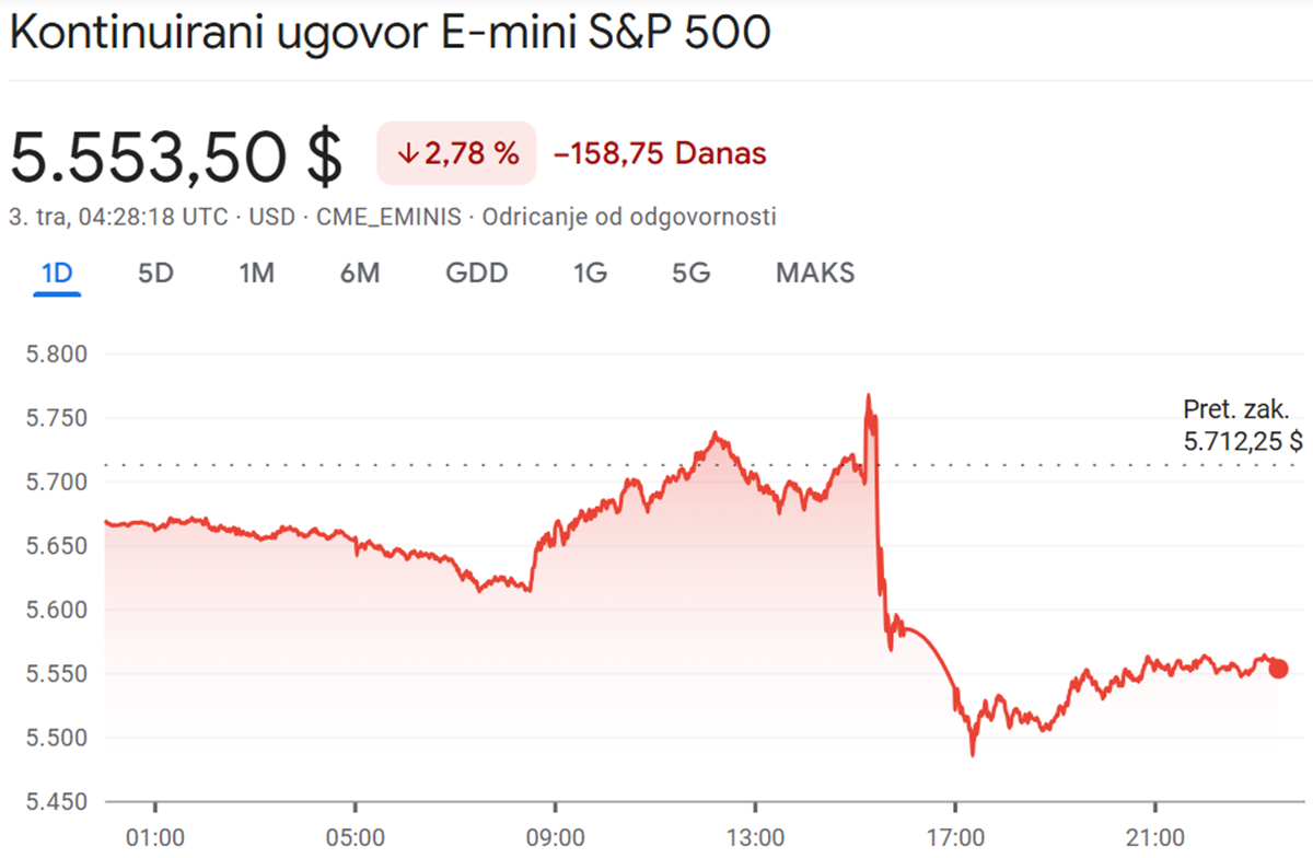Futuresi S&P 500 indeksa, koji pokazuju gdje bi taj indeks mogao biti nakon otvaranja u četvrtak, pali su za 3%.