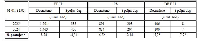 U tablici ispod dajemo prikaz ukupno raspoređenih sredstava entitetima i Brčko distriktu BiH sa pripadajućim spoljnim dugom za prvih pet mjeseci 2025.godine u poređenju sa istim periodom prošle godine. Svi iznosi su iskazani u milionima KM.