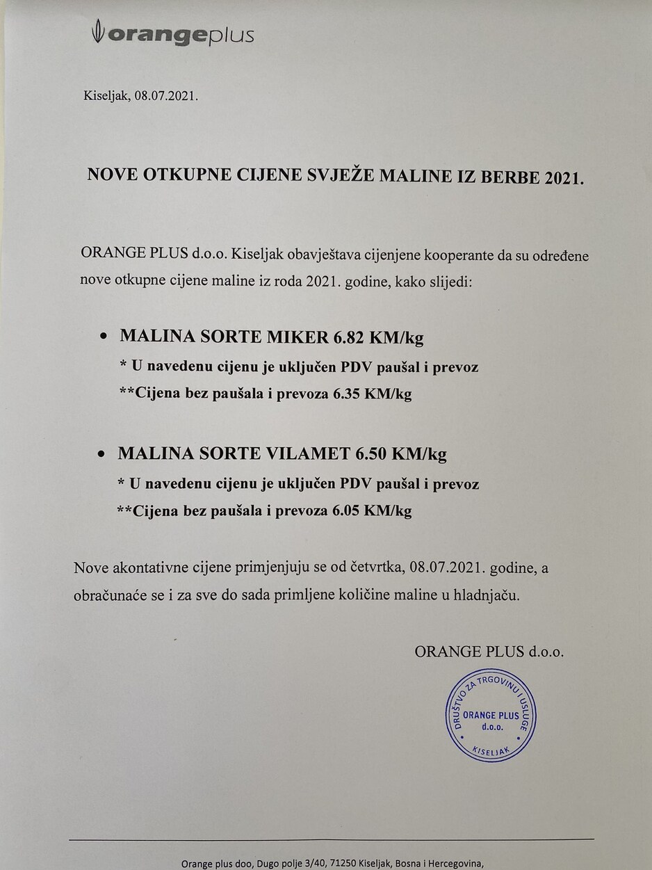 Tako je prema posljednjim informacija od danas Orange plus iz Kiseljaka objavio nove cijene malina sorte miker od 6,82 KM po kilogramu, a u cijenu je uračunat PDV paušal i prijevoz, dok je 6,50 KM po kilogramu otkupna cijena za maline sorte vilamet, prenosi Klix.