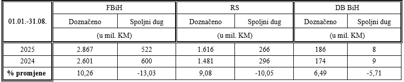 U tablici ispod dajemo prikaz ukupno raspoređenih sredstava entitetima i Brčko distriktu BiH sa pripadajućim spoljnim dugom u osam mjeseci 2025.godine u poređenju sa istim periodom prošle godine. Svi iznosi su iskazani u milionima KM.