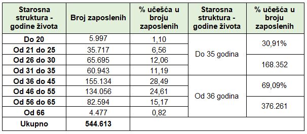 Prema službenim evidencijama Porezne uprave Federacije BiH na dan 30.4. 2025. godine do 35 godina života zaposleno je 168.352, ili 30,91% zaposlenika, a preko 36 godina života zaposleno je 376.261 ili 69,09% zaposlenika. Na dan 30.4.2025. godine zaposleno je 302.284 ili 55,50 % muškaraca i 242.329 ili 44,50% žena.