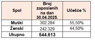 Broj zaposlenih prema prebivalištu zaposlenika na dan 30.4.2025. godine je 544.613. U odnosu na objavljeni podatak o broju zaposlenih na dan 31.3.2025. godine, kada je broj zaposlenih iznosio 542.803, veći je za 1.810.