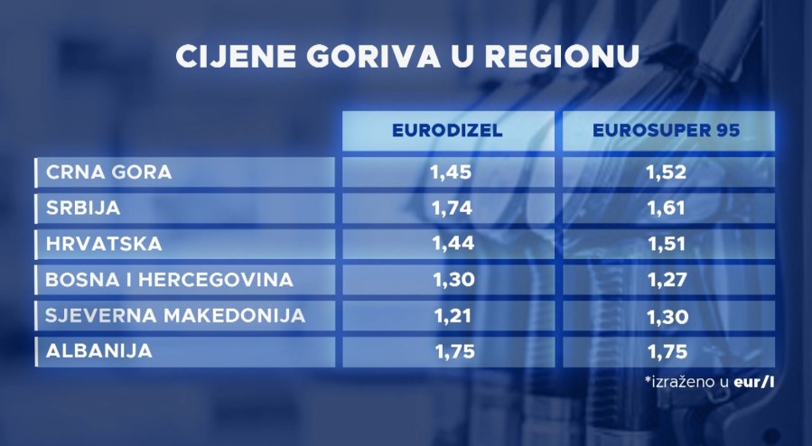 Dok se to ne desi, građani Crne Gore rezervoare pune po cijenama koje su znatno niže u odnosu na Srbiju i Albaniju i to od 10 do 30 centi, dok je gorivo kod nas skuplje nego u Bosni i Hercegovini i Sjevernoj Makedoniji za 10 do 20 centi, a po cent u odnosu na Hrvatsku.